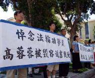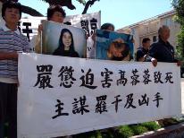 与会者打出“严惩迫害高蓉蓉致死主谋罗干及凶手”、“严惩毁容凶手唐玉宝、姜兆华”、“呼吁中领馆员工支持陈用林告别中共 停止迫害法轮功”等横幅,以及高蓉蓉的遗像和被毁容的照片。著名民运人士、《中国事务》网站主编伍凡、国际大赦组织克莱蒙学院分部负责人 Sarah Cook、法轮功学员代表吴英年、李有甫和 Brad Carson在集会上讲话。