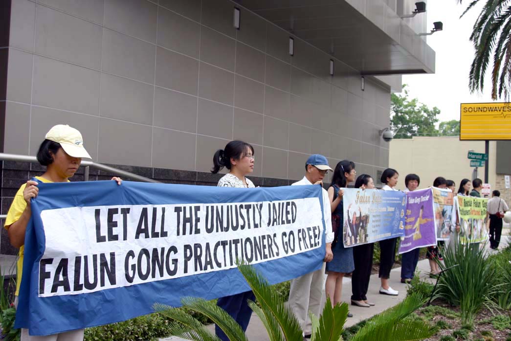 【明慧网2005年6月23日】(明慧记者舒静休士顿报导)2005年6月22日中午,休士顿部份法轮功学员在中领馆前集会,强烈谴责中共酷刑虐杀中国大陆法轮功学员高蓉蓉的残酷暴行,引起了路人的关注。