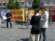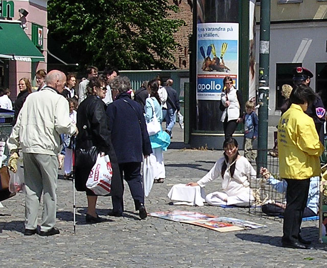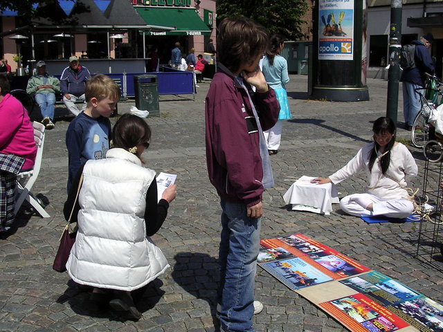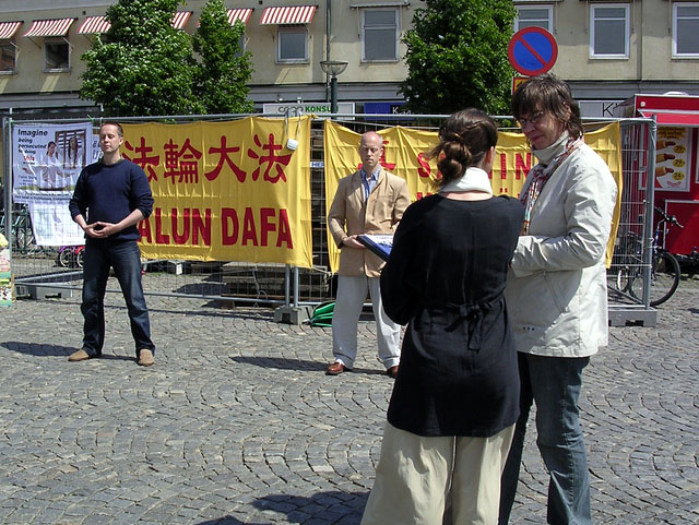 隆德是瑞典南部的一座小城,但历史悠久,素有“大学城”之誉。这是学员们第一次在此举办反酷刑展。活动刚开始不久,一位中国留学生走了过来,饶有兴致的观看展板并开始提问,一位学员耐心的向他讲着真象。像许多来自中国大陆的民众一样,他不知道六年以来,在中国发生着的迫害如此残酷。他问了许多问题,索取了各种真象资料、光盘,并留下了自己的地址,希望学员给他寄一张教功的光盘。临走前,他高兴的说:来此一年多了,听说在马尔默有炼法轮功的,去过几次,都没有找到。今天,能在这儿见到你们,真是太巧了! 原来,他与朋友原计划去野炊,后来听到天气预报说今天会有大雨,便取消了计划,他才得以到广场来。
