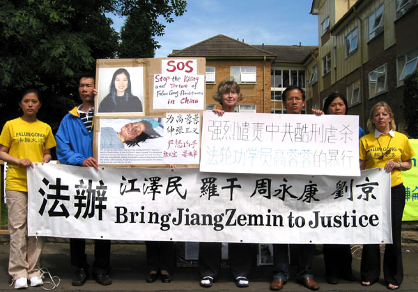 一些路人驻足观看,并接受了真象资料。一位路过的中年妇女在看了有迫害照片的展板后不断的用手在胸前画十字,虔诚的为学员祈祷,同时在征签表上写上自己的名字支持反迫害。也有不少来中领馆办理签证事宜的中国人和英国人拿了真象资料并观看了介绍法轮功受迫害真象的展板。