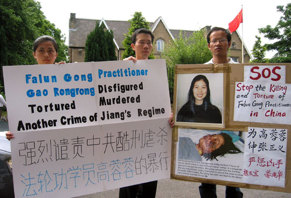 法轮功学员在中领馆前展开写有“强烈抗议中共酷刑虐杀法轮功学员高蓉蓉的暴行”以及“严惩凶手唐玉宝,姜兆华”的横幅,同时展开印有高蓉蓉被迫害前以及被迫害后照片的展板,揭露中共暴行,揭示高蓉蓉被迫害致死的真象。除此之外,法轮功学员们也展示了许多中共迫害法轮功学员所采用的酷刑的图片。