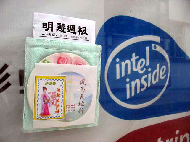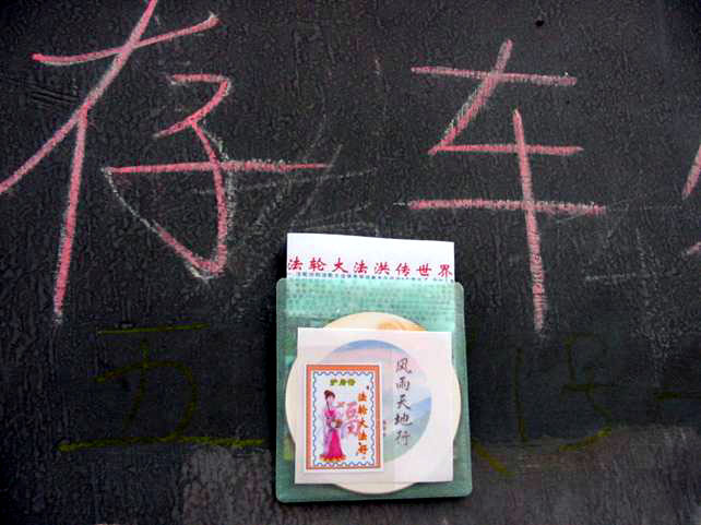 ![]() 太原解放路宽银幕汽车站广告栏里的真象光盘、明慧周报山西版、护身符组合 | ![]() 太原半坡街存车处的真象光盘、传单、护身符组合 |