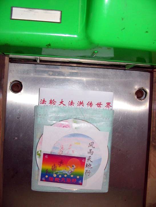 ![]() 太原市委、市政府附近电话亭里的真象光盘、传单、护身符卡片组合 | ![]() 太原庙前小学附近街上电话亭里的真象光盘、明慧周报城市绿洲、护身符组合 |