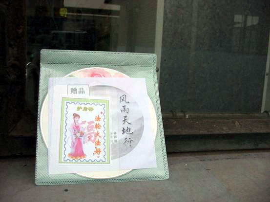 ![]() 太原白桦苑小区花园里的真象宣传画、传单、光盘和护身符卡片组合 | ![]() 太原饭店里真象光盘、卡片、小册子组合 |