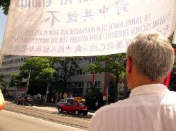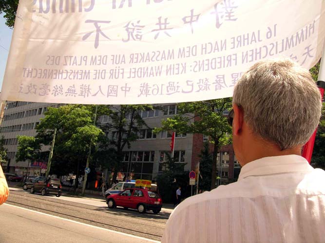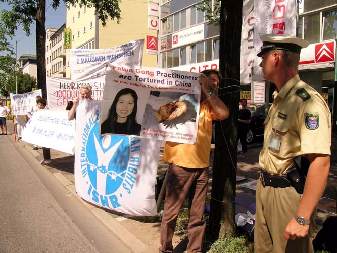 【明慧网2005年6月25日】2005年6月23日中午,中国驻德国法兰克福总领事馆开张,中德人权人士和法轮功学员在马路对面進行了请愿抗议活动,提醒参加开张仪式的中国及德国官员关注中国目前仍受到关押的十万多名政治犯和被迫害的法轮功学员。