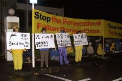 新西兰学员2005年6月21日夜晚在奥克兰中领馆前举行请愿活动,向公众揭露中共残酷迫害法轮功的事实真象,呼吁严惩虐杀大陆法轮功学员高蓉蓉的凶手。