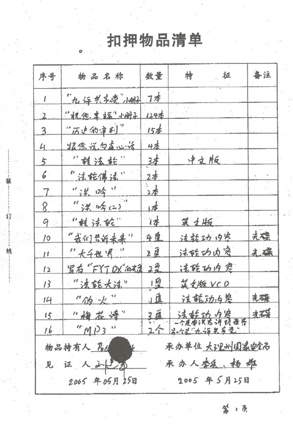 当我们到达大理公安局或610办公室(专门迫害法轮功的部门)时,他们从我包里拿走了所有和法轮大法有关的物品。他们没收了我的物品,并给了我一张清单,上面有我的手印。然后,他们让我坐在屋子中间。那时有十个人在屋里。有的人讯问,有的人照相,有的人记笔记。