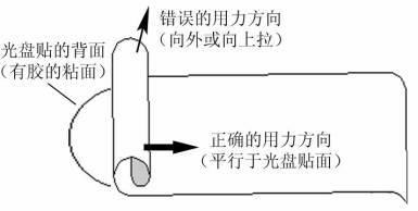 方法(1)、如图4:先将光盘贴上端揭起一少部份,然后用双手向下方捻衬纸,使衬纸与光盘贴分离,当到将近一半时,也就是除了最中间的圆之外,保证其它两个圆圈都有一半左右与衬纸分离,保持这个状态将光盘贴的外围对准光盘边缘、小心贴好已经分离的这部份,接下来拉下衬纸前端(注意用力方向),就是已经与光盘贴分离的部份,因为光盘贴的一半左右已经粘贴固定在光盘上了,其余的部份就可以很轻松的贴在光盘上,然后按平即可。