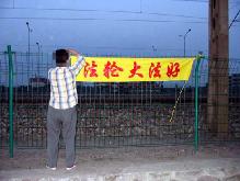 ![]() 同修正在挂“法轮大法好”条幅 | ![]() 人们从“法轮大法好”条幅旁经过 |