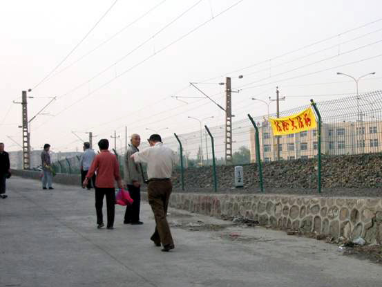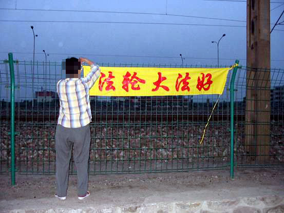 我们没有受便衣的影响,继续做该做的事情,从西向东穿过铁路桥洞,去铁路东面、早市附近的路上挂上“法轮大法好”条幅,把“法轮大法洪传世界”的宣传画贴在条幅对面的墙上,继续向东散发真象材料。当我们7点返回时,条幅一直挂着,黄底红字的大法好条幅非常艳丽、醒目,吸引了许多去早市的、晨练的过往路人的目光,人们边走边看边念“法轮大法好”,甚至三三两两停下来议论:“法轮功真厉害!”我拍下了同修挂条幅的照片和人们纷纷扭头观看大法条幅的照片。