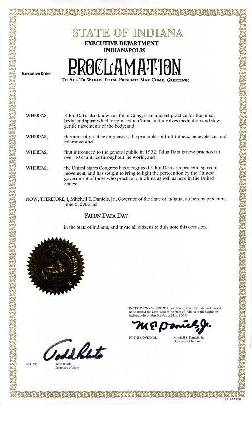 因此,现在,我,印第安纳州(Indiana)州长米切尔•丹尼尔斯(Mitchell E. Daniels, Jr.)特此宣布2005年6月9日为印第安纳州