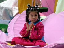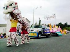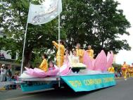 我们的队伍包括载有6英尺高的大莲花的花车, 身着金色炼功服的鼓队,舞狮, 和炼功表演。今年在三皇岛上参加游行的花车和队伍中,我们的首次亮相令观众赞叹不已。观众们欢呼着队伍中他们所熟悉的三皇岛上学员的名字,为看到了大法的神圣和美好而惊喜。大花车是由三皇岛上的学员们带头设计和制作的, 也是本次游行中人们赞誉最多的花车。