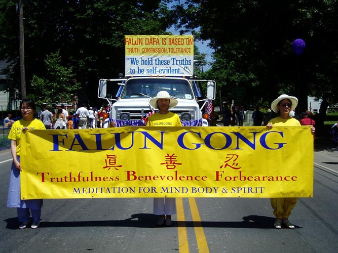 今年的独立日,蓝蓝的天空洒下灿烂的阳光在每个大法弟子的身上,法轮功的游行队伍以美国特色的花车及中国传统文化的腰鼓队和仙女队为主。花车上有老、中、青、幼不同年龄的大法弟子演示五套 功法,还有四位装扮成美丽的莲花仙女,盘着腿,舞动着优美的“花仙舞”。路旁的游人惊喜的欢呼着:“BEAUTIFUL! BEAUTIFUL!”(太美了!太美了!)还有的人学起了“花仙舞”的动作。