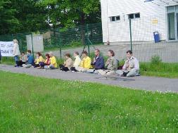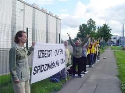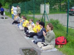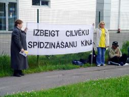 【明慧网2005年7月11日】2005年7月8日拉脱维亚大法弟子在中使馆前举行了请愿活动, 呼吁社会关注在中国已经持续了6年的对法轮功的残酷迫害。大法弟子打出了“停止虐杀”等横幅。过往行人和车辆都减慢了速度来观看。很多人都拿了大法弟子派发的真象传单。很多人了解真象后都对大法弟子在中国的遭遇表示同情,希望这场迫害尽快的结束。