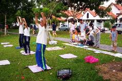 每个周末的傍晚,马来西亚新山法轮功学员都在公园示范功法,同时摆放真象展板、洪法讲真象。