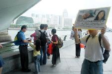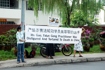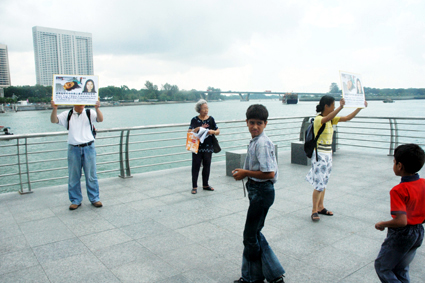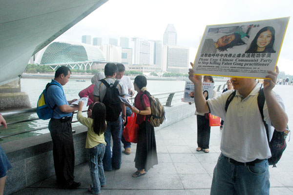 新加坡法轮功学员几个人一组的,高举着真象展板,穿行在新加坡的大街小巷,告诉人们发生在中国的可怕的虐杀事件,唤醒善良的人民关注并帮助被虐杀的中国法轮功学员。