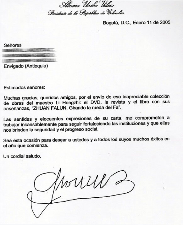 【明慧网2005年7月16日】哥伦比亚总统阿尔瓦罗-乌里韦-贝莱斯(Alvaro Urile Velez)在收到法轮功学员给他的真象材料后,于今年1月11日复信给学员表示感谢。