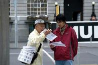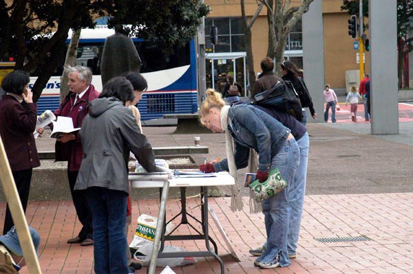 【明慧网2005年7月17日】中共和江氏集团对法轮功的迫害已经持续了六年,“7.20”前夕,新西兰法轮功学员于7月16日汇集在奥克兰市伊丽莎白广场,举行新闻发布会,呼吁立即停止迫害。新闻发布会之后,法轮功学员沿奥克兰最繁华的皇后大街进行了游行。当天法轮功学员还同时举办了反酷刑展和“真善忍”艺术展。