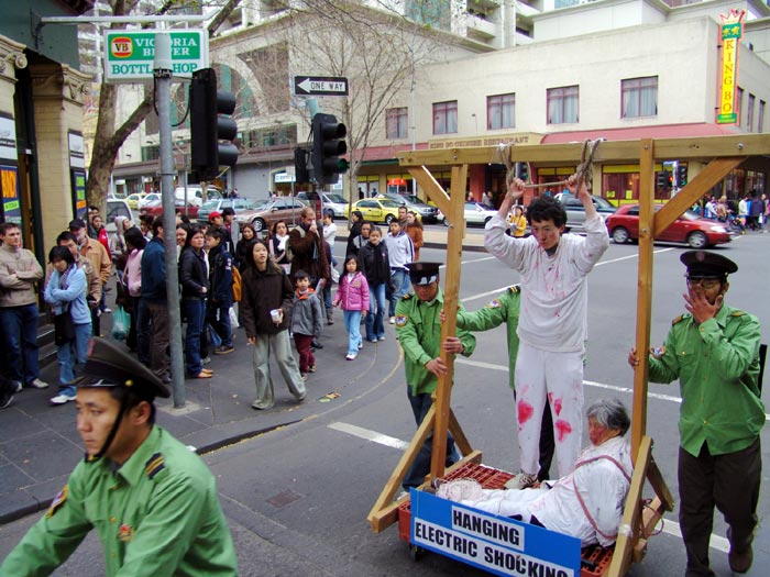 中午12点学员们开始了穿越市中心包括唐人街的游行。三个手持“真、善、忍”牌匾的孩子走在队伍的最前面,紧随其后的是腰鼓阵和七面赤、橙、黄、绿、青、蓝、紫的旗队,然后是身着白色服装,手持花圈悼念在中国被迫害致死的同修的法轮功学员们,再后面就是真人模拟酷刑演示及“诉江”的队列。