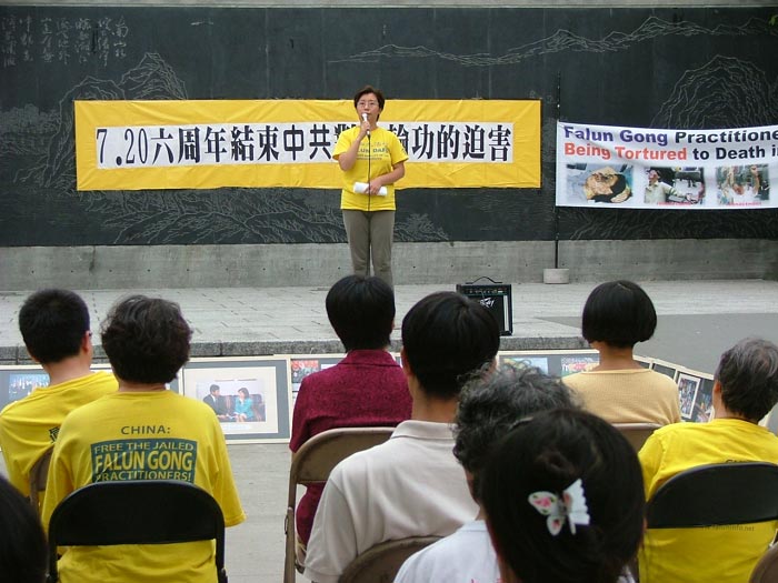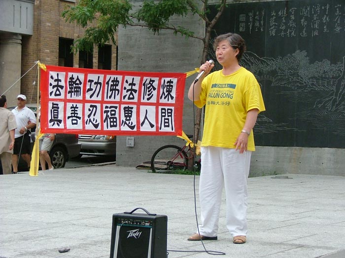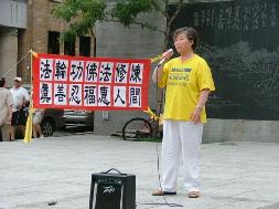 在99年7月20日中共迫害法轮功时刚刚学炼法轮功的仲妈妈,以自己的亲身体会,告诉同胞“法轮大法好”。她说:修炼法轮功之后,身体多种疾病很快就好了;但是(中共)政府突然宣布不准炼了,24小时不间断的诬蔑宣传,还有人到我家里说不能出去炼,收了我的法轮功的书,我心里很难受。我女儿在加拿大,说国外允许炼,我就出国了。六年来,我身体越来越好,没有吃过一粒药。但是我的国内同修却被关在监狱里,所以我天天都讲真象,呼吁停止迫害。我给国内的人打电话,呼吁他们不要相信中共的诬蔑宣传,告诉他们70多个国家的人修炼,从来都没有自杀自焚的。可是有些人却说“‘焦点访谈’里说的,怎么能是假的呢?”可见,一些老百姓被中共欺骗到了没有辨别能力的地步。