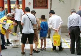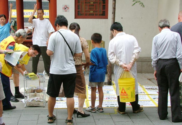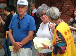 在4个小时的集体炼功、集会演讲过程中,很多中国同胞和西方游客一边接受真象资料、一边倾听学员的心声。街边的摊主甚至因为专注学员的演讲,而忘记了招呼生意;很多人表情凝重,对中共的残暴摇头以对。