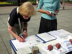 这次还有一个明显感觉是,能住步停下来听学员讲真象的人们大多数都愿意在反迫害征签表上签名,笔者不时看到游人听学员讲真象后就转到征签桌前去签名。有五、六个类似旁克式穿着黑色奇装异服、留着很怪发型的德国男女青年,听学员讲真象后知道是反迫害,也走过来签名支持,桌前正有两人在签名,他们就耐心等着,没有喧闹,他们中有的人甚至在每个表上都签了名;有一个年轻男子,了解真象后对功法感兴趣,把学功时间和地点都记了下来,道别后走到同伴那里,却又走回来问在哪里签名。原来他的同伴签名后就在一边等他,从同伴那里得知我们在征签后又返回来补签名。