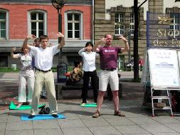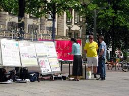 笔者在征签时遇到一个有趣的事例。在展台附近的一条长凳上坐着一个年纪约六十来岁的德国人,好象无聊又无奈的打发着时光,给他传单不接,给报纸也不要,于是我就给他讲:那边正演示的静功叫法轮功,法轮功在中国受迫害已经六年了。中国共产党和希特勒一样也是独裁者,中国至今仍然没有民主和信仰自由。