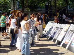 2005年7月17日,温哥华骄阳如火,法轮功学员顶着酷暑走上街头,向民众讲真象,呼吁制止中共对法轮功的血腥镇压。