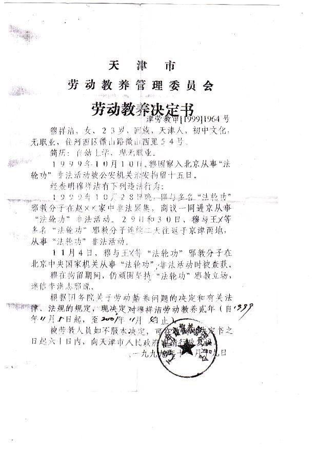 1999年10月28日进京上访,在信访办被中国天津红桥区分局非法劫持,并遭毒打,后被非法劳教2年。