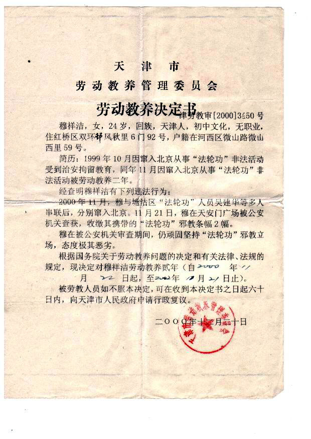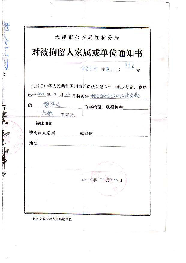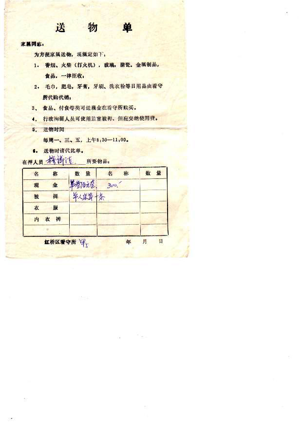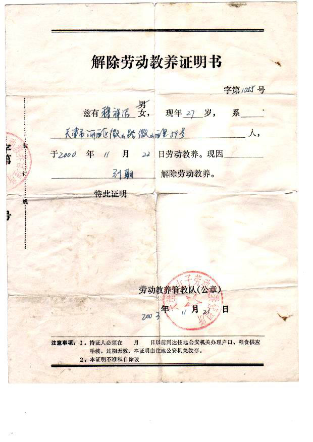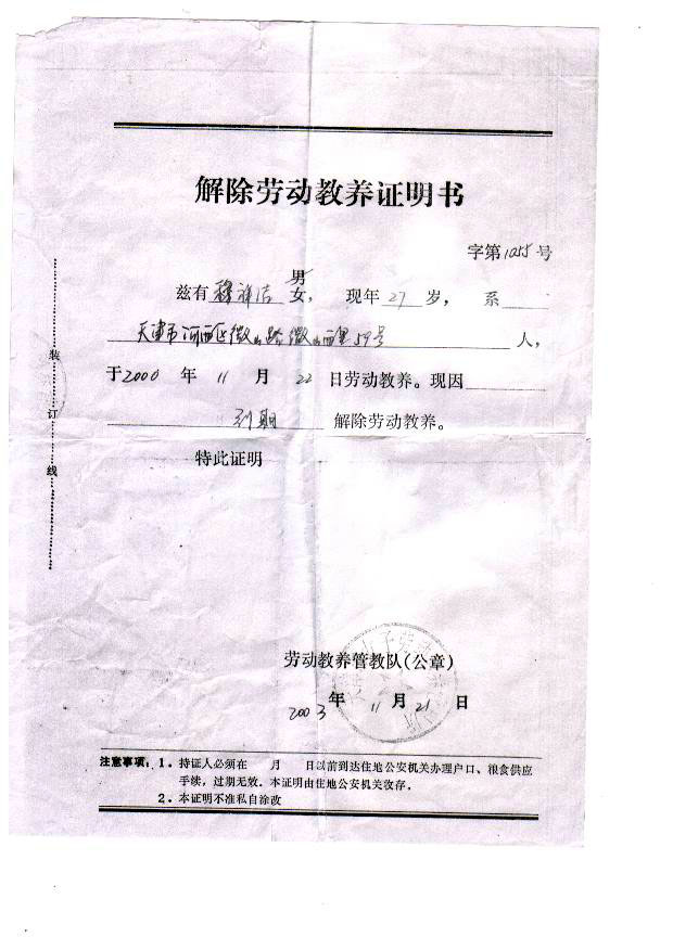 2000年2月中旬恶警给我进行造谣中伤,孤立打击。由于高压迫害,迷了心志,写了一些不该写的东西,2000年8月,家里人花钱,把我保了出去,才脱离了那个人间地狱———天津板桥女子劳教所。