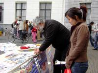 有一位小姐问,中国是一个大国家,看起来经济发展的这么好,怎么会有这样的事情出现呢?学员告诉她,“中共非常善于伪装,这些迫害都是秘密進行的,所以国际社会没有看到。就连中国经济,也只是表面繁荣,本质上存在很大危机。”这位小姐同意签名,支持法轮功学员的反迫害。