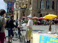 宽阔平坦的老歌剧院广场上,明亮的阳光伴随着清凉的微风,人们从容而悠闲的漫步着,年轻的男女风一般骑着各式跑车,体验着自由的感觉。来自附近城市的十几位法轮功学员在静静的演示着功法,展示着酷刑后血肉模糊的照片。