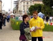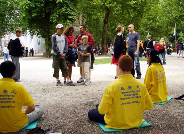 法轮功学员们每年国庆节都会举办洪法活动,人们对法轮功表现出的兴趣一年比一年大,真善忍的美好正走进越来越多比利时人的心中。