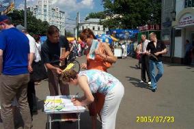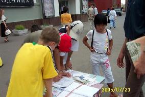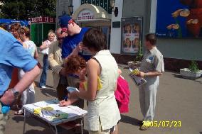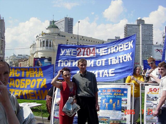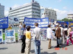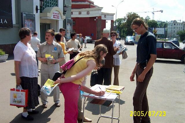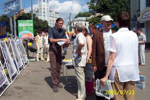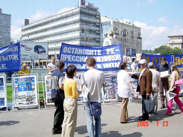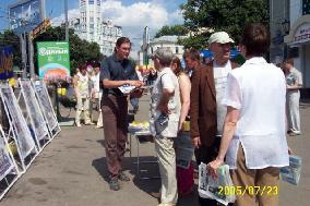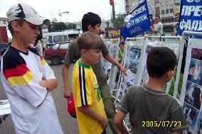 一位中国年轻人来到展板前,小弟子索尼娅马上送去真象资料,他愉快的接受了。学员向他讲真象,他说:“展板上说的这些事,我过去不知道,我听到和看到的都是(中国)国内报纸和电视上讲的。但我也想过,国内国外这么多人炼,一定不是个简单问题,这些材料我拿回去好好看看。”