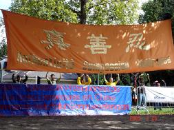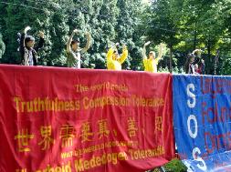 ![]() 学员打出“真、善、忍”横幅 |