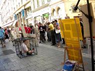 在市中心展台的左侧,摆放的是法轮功的真象资料,以及法轮功在全世界洪传的盛况的展板;右侧展出的是:法轮功学员在中国所受到的种种酷刑折磨的图片和部份酷刑刑具,在这些惨不忍睹的图片面前,人们无不为之动容。