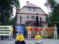 【明慧网2005年7月28日】在7.20六周年全球法轮功学员纷纷抗议中共对法轮功的残暴镇压之际,7月25日下午5点,来自爱沙尼亚、拉脱维亚和芬兰的部份法轮功学员也来到中共驻爱沙尼亚首都塔林的使馆前,举行了和平抗议活动,制止这场已经持续6年之久的对法轮功的迫害
