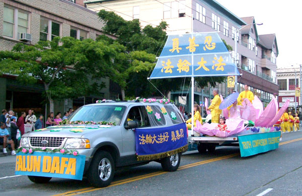 【明慧网2005年7月29日】2005年7月24日,来自美国华盛顿州各地和俄勒冈州波特蓝的法轮功学员,参加了一年一度的西雅图中国城海洋节游行(Chinatown Seafair Parade),受到中西方民众的热情欢迎。