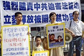 【明慧网2005年7月29日】新唐人电视台驻香港记者梁珍的母亲与哥哥,19日在四川省泸州市被公安强行拘留。7月27日,梁珍和支持她的社会人士,齐聚在中联办外,公开谴责中共漠视人权,要求中共当局立即无条件释放她的母亲和哥哥,并呼吁各方关注受迫害的法轮功学员。