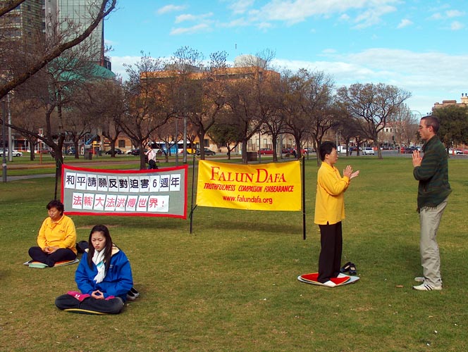 【明慧网2005年7月29日】自1999年7月20日至今,由江泽民和中共发动的对法轮功民众的镇压和迫害已持续进行了6年,而海内外法轮功学员以和平理性的方式进行的反迫害也坚持了6年。每年的7月中旬,世界各地的法轮功学员纷纷举行游行集会、烛光守夜、在中国使领馆前静坐抗议等活动,悼念被迫害致死的大陆同修并呼吁制止迫害。2005年7月23日,南澳阿德雷得(Adelaide)的法轮功学员在市中心维多利亚广场(Victoria Plaza)拉开横幅、摆放图板,展示功法,征集签名,呼吁人们关注和支援反迫害。
