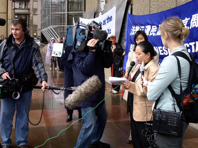 Alice讲了一个她来游行集合点路上的故事:她向两位警察问路。一位警察看着她的带有“法轮功”字样的服装问:“法轮功是什么?”另一位警察马上过来拍着他同事的肩膀说:“法轮功你都不知道?”接着便向他解释什么是法轮功。那位警察还不满意,又转向Alice讨教。Alice向他讲了法轮功和这场迫害的真象后,他马上要求签名支持反迫害。