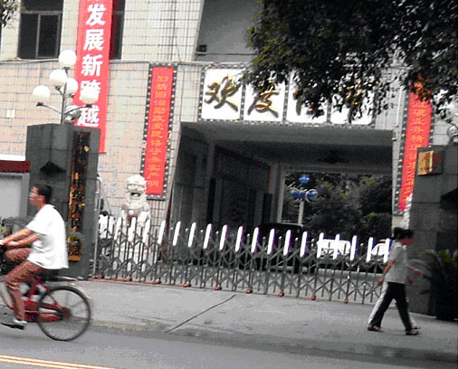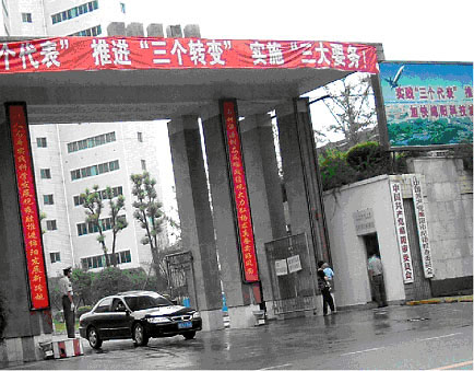 图十一、四川省绵阳市新华劳教所大门,背后是劳教所新总部办公大楼。是邪恶迫害大法弟子的魔窟、黑窝。在它的后面是奴役劳教人员的大砖厂,是西南地区第一大红砖生产基地。位于绵阳市游仙区小枧镇一心村。