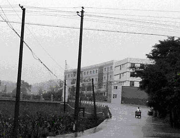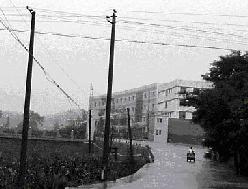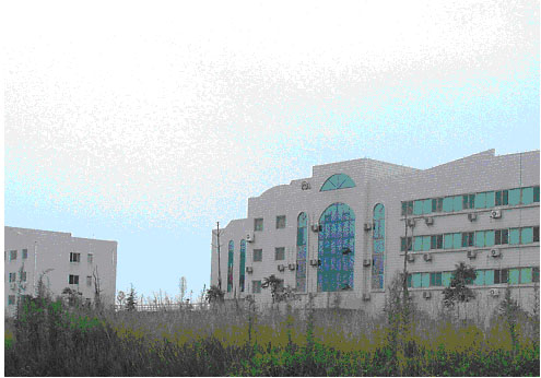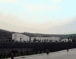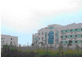 图十二、四川省绵阳市新华劳教所。画面上两幢楼都是五层楼。左侧一幢楼是邪恶非法关押、摧残大法弟子的六大队,大法弟子被非法关押在三楼上。正对中间一幢楼是邪恶的四大队,被称为“魔鬼四大队”,2003年前,部份大法弟子被强制挟持在四大队各个中队进行摧残、迫害。从顶楼到底楼分别是一、二、三、四、五中队。右侧的圆顶房是劳教所大食堂,一千多人的聚餐地。在它们的中间是大操场,是劳教所每次开邪恶谤法大会的地方。