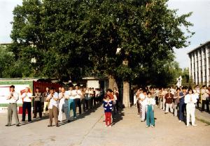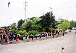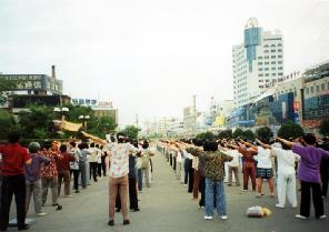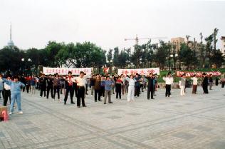 1998年5月15日是师父传功讲法六周年,长春地质宫外圈法轮功学员炼功场景。那天正值原国家体委主任到长春视察。
