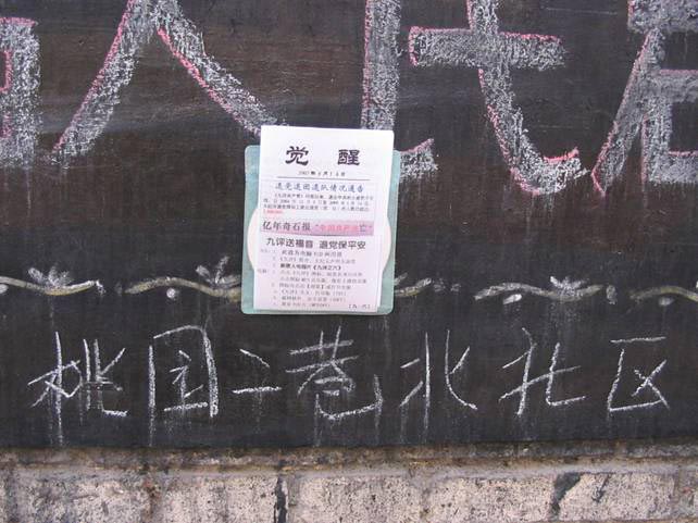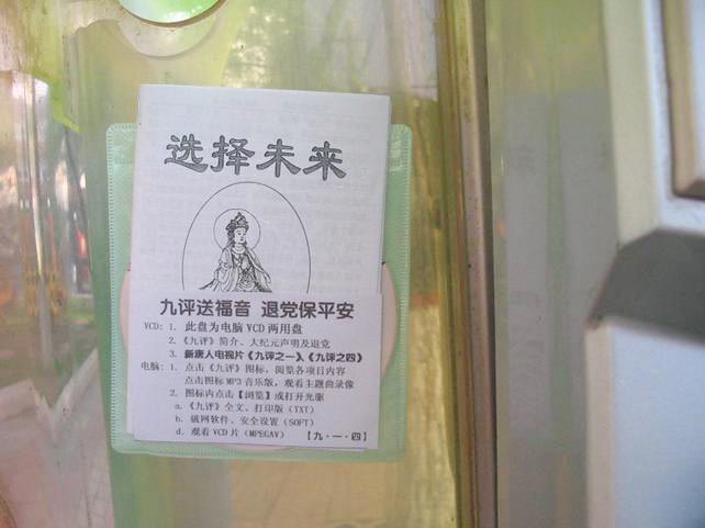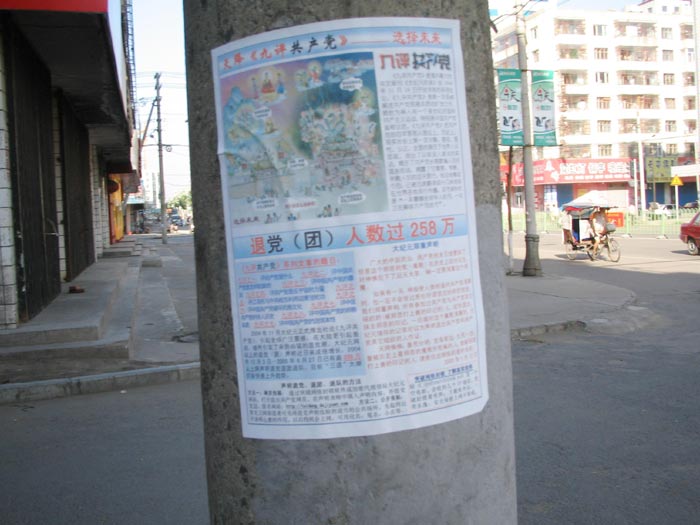 【明慧网2005年7月5日】近日,山西省太原市、黑龙江省牡丹江、吉林省吉林市等地区出现大量有关《九评》及退党的材料,有《九评》书籍、光盘、小册子、传单,张贴的宣传画,用U盘、软盘拷贝。和全中国一样,太原的许多市民已知道《九评》,争相传看《九评》,了解了中共的流氓邪恶本质。