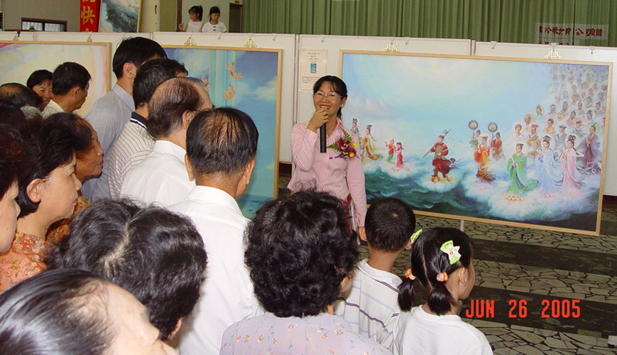 退休的绘画教师朱美娘女士,为这次美展做导览。展出的都是修炼法轮功的画家的作品,除了表现法轮大法的美好外,展览中有一部份揭露中共对大陆法轮功学员施以迫害酷刑的作品,更是触动着参观者的心。参观民众无不受“迫害画作”的震撼,一位老先生频频表示:“怎么会有人能这么残忍?”