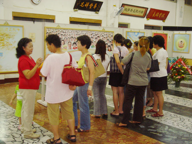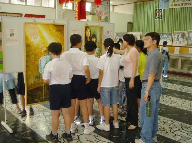 每天画展上来了很多看画的人、有人问:画是真的吗?这些酷刑是真的吗?你们不要炼就好了?在家炼吗?小朋友问:为什么要打他呢?这些问题都透过导览细心的讲真象,使他们明白。