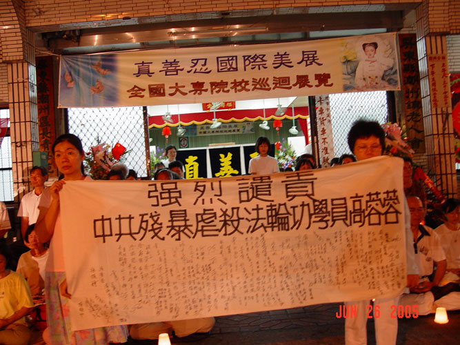 展厅大门出口放置了揭露大陆法轮功学员高蓉蓉被虐杀情况的展板,民众看了,都不敢相信这种事竟发生在21世纪的社会,除表示同情外也纷纷签名声援制止这场迫害。晚上在美展前人行道上举行法轮功学员高蓉蓉追悼会默哀一分钟、呼吁大家来制止迫害、关注这场发生在中国大陆自1999年至今仍未停止的对法轮功学员的群体灭绝迫害、并呼吁中共立即停止迫害,严惩杀害高蓉蓉的凶手。