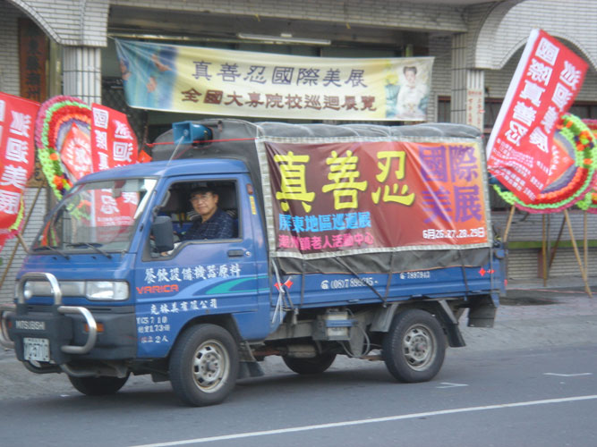 开幕前二天广播车绕着大街小巷用国语、台语、客语广播、派发传单、6月27日晚上法轮功学员们利用商展时拿着展板带着传单分四组在人潮中散发传单邀约大家看画展。