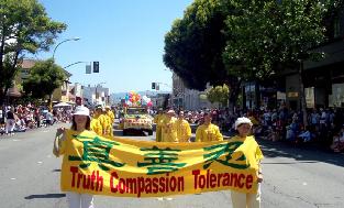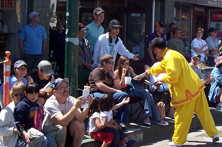 队伍经过时,热情的民众有的鼓掌,有的向学员挥手致意,有的欢呼“法轮功!法轮功!”。